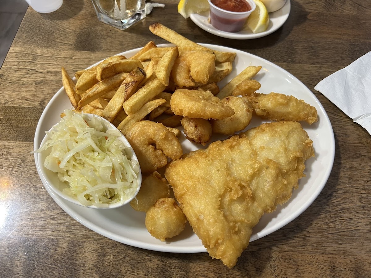 Had the 1/2 chips - 1/2 slaw option with cod, shrimp and scallops. Cod and shrimp were excellent, scallops a bit on the small side but all were VERY good. My wife had the halibut and it was excellent. Service was friendly, warm, attentive and professional. Restaurant is a little sterile, the fluorescent lighting makes you feel like you're in a laboratory but the place is bright and spotless. Kitchen and staff were very visible and the cleanliness was a major plus. We thought it was very good value for where restaurant prices are nowadays. Will definitely return.