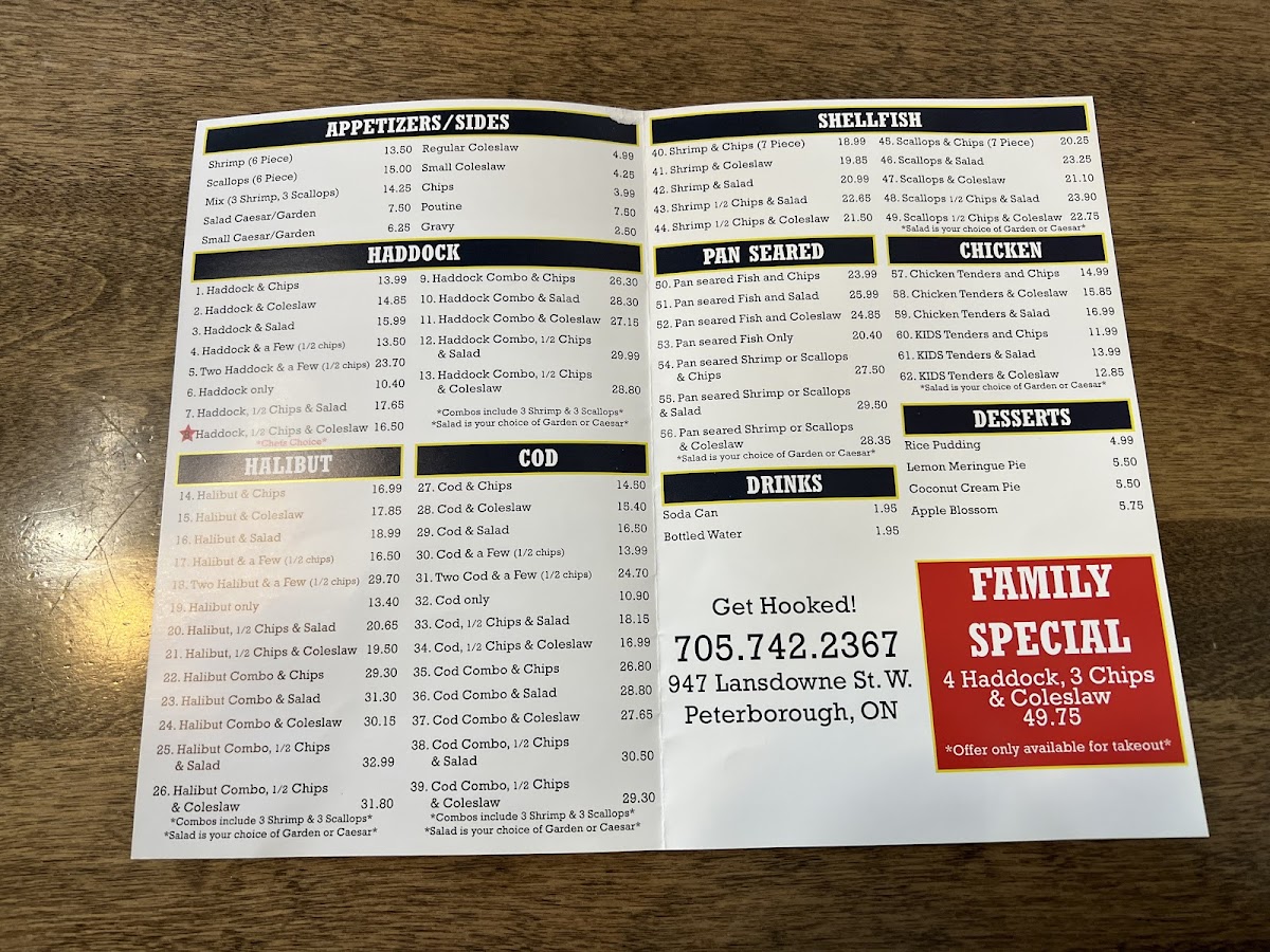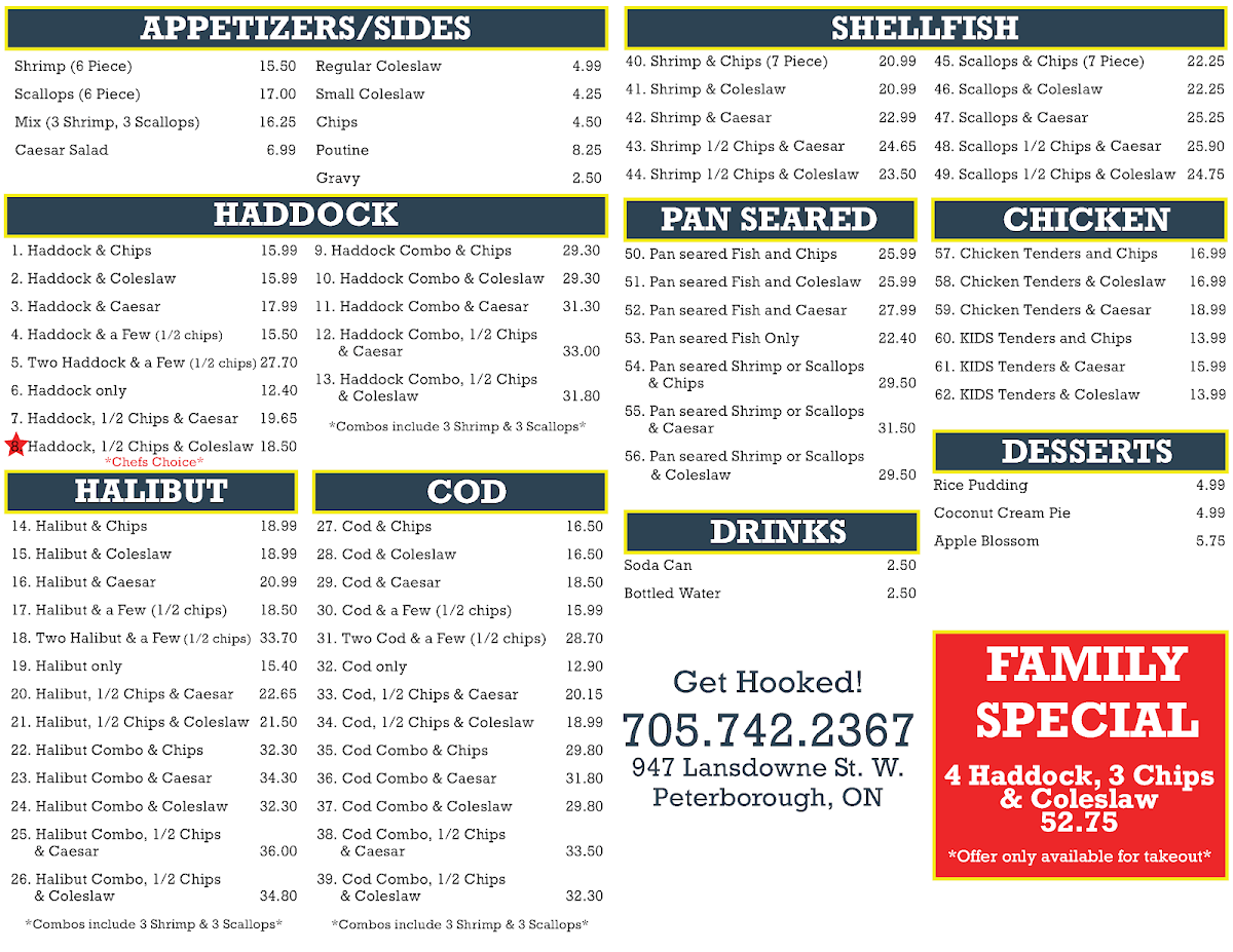 Big Ben's Fish and Chips offers a straightforward and inviting menu centered around classic fish and chips fare. The menu features generous portions of seafood favorites like haddock and halibut, complemented by a variety of sides and salads. Whether you're stopping by for a quick lunch or settling in for a casual dinner, the selection strikes a comforting balance between hearty and familiar.